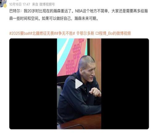 在这一次的活动采访中,巴特尔说出了自己内心的感受。他认为在这个年龄段,杨瀚森能够取得这样的表现和成绩已经相当厉害,拥有着很大的潜力。对比当年自己20岁时候已经相当厉害,相当优秀。所以他希望我们中国球迷能够耐心一些,给予杨瀚森更多的时间成长,相信他一定会给予我们更多的惊喜。说白了在这些前辈看来,杨瀚森就是我们中国男篮未来的希望。他也知道年轻人要成长需要时间,需要沉淀,需要磨练,所以是着急不来的。