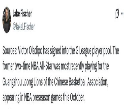 北京时间11月8日,据名记Fischer报道,两届NBA全明星奥拉迪波已签约加入发展联盟(G联赛)球员池,预计将在发展联盟继续自己的职业生涯。