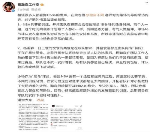 11月5日,据白鹿视频报道,@杨瀚森工作室 发文回应杨瀚森近期争议。